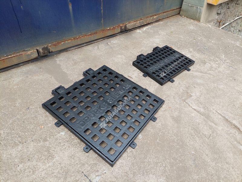 • Besi Cor (Cast Iron): Material paling banyak digunakan karena kokoh, tahan lama, dan mampu menopang beban berat seperti kendaraan bermotor. Cocok untuk area jalan raya, pelabuhan, dan kawasan industri.